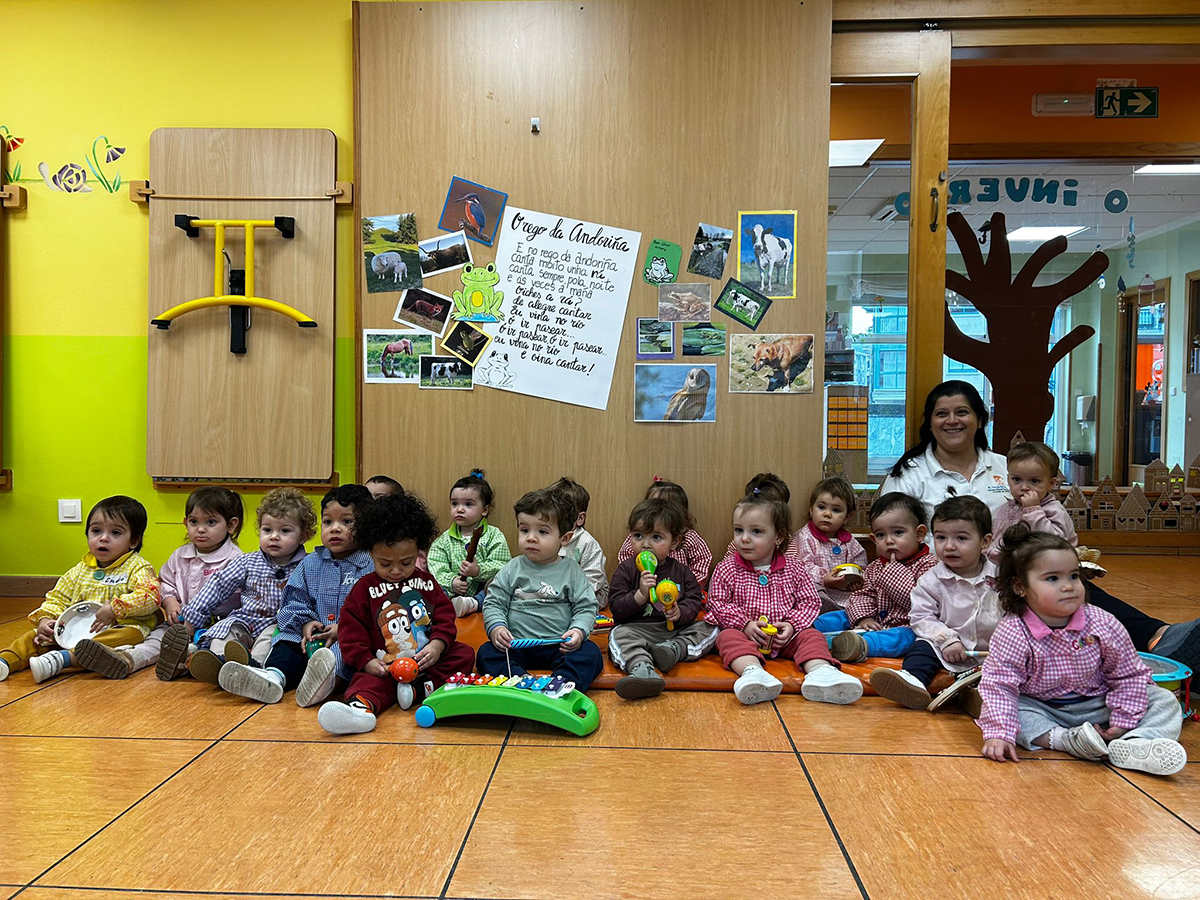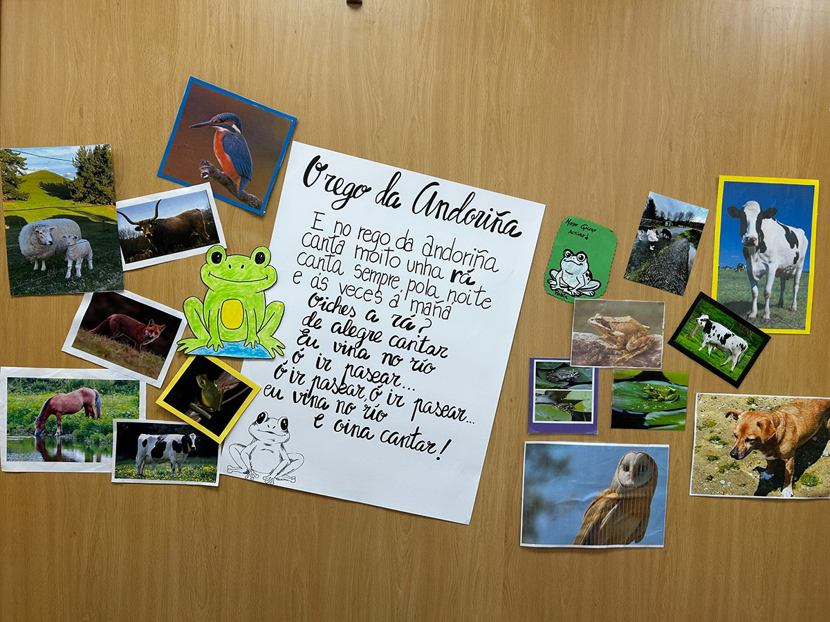 Esta semana adicámoslla ao Rego da Andoriña, todos os nenos trouxeron da casa unha foro dun animal que puidera vivir preto do Rego da Andoriña, e trouxeron un montón de animais variados grilos, ras, sapos, cabaliños do demo,, vacas, pegas, andoriñas, serpes picapeixes, troitas… Falamos destes animais e imitamos os sons dos que non coñeciamos o son inventamos un son novo. E con todo isto e un instrumento musical que cada un trouxo da súa casa, convertémonos na Orquestra Andoriña. Pasámolo xenial e coñecemos novos animais que algúns ainda non coñecíamos.