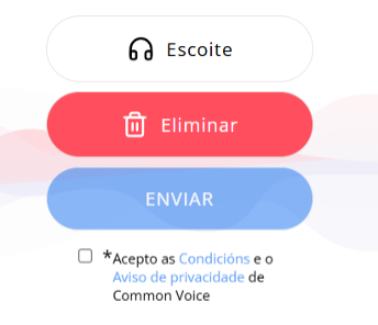 - Estades colaborando nunha iniciativa de carácter público e aberto. A vosa voz formará parte dunha base de datos pública que se vai empregar para o desenvolvemento de ferramentas de recoñecemento da fala en galego. Porén, non se vai expor ningún outro dato de carácter persoal (nome, idade, procedencia etc.), só se van empregar as gravacións de voz.